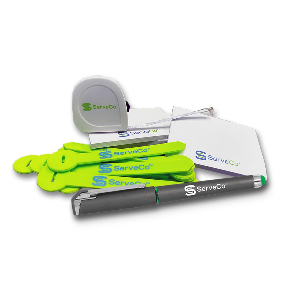 Branded Post-it Notes, Dark Gray Stylus Pen, Green Cable Ties, & 10' Travel Measuring Tape. (Items Sold Seperately)